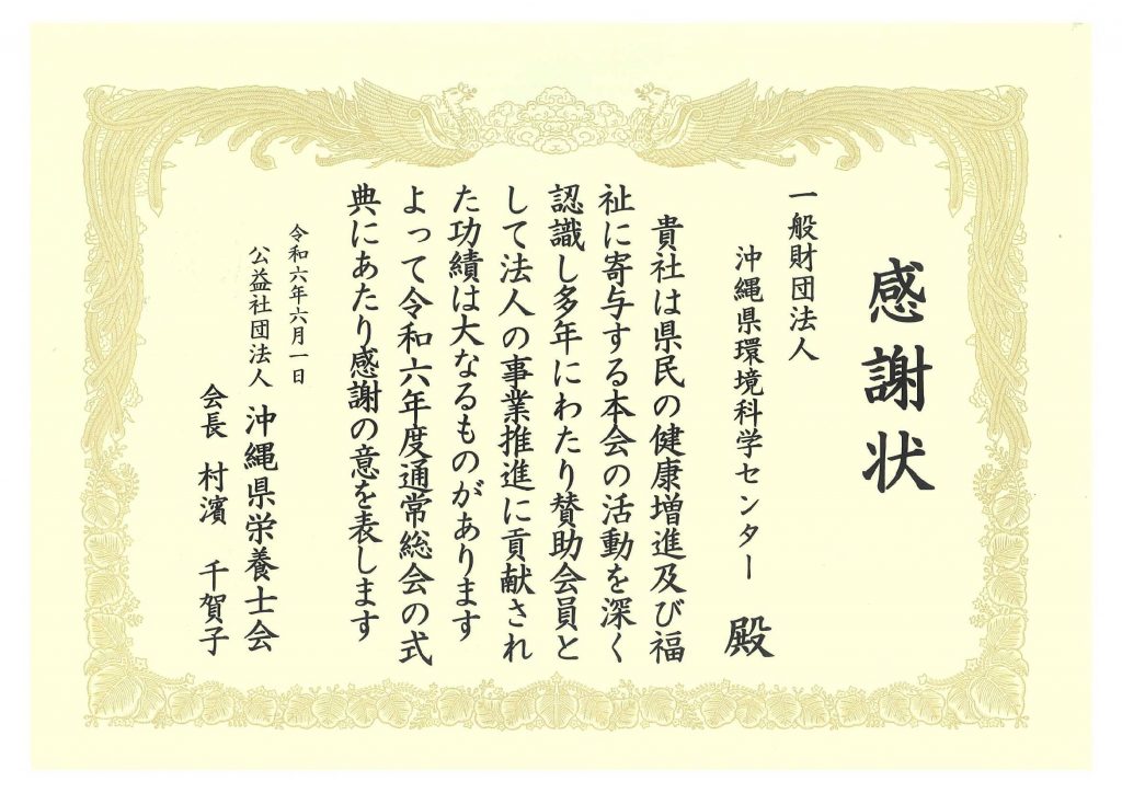 公益社団法人沖縄県栄養士会様より感謝状をいただきました。